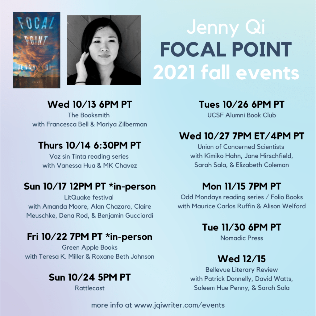 - Angelo Mao, the only other biomedical scientist/poet I know of, reviewed Focal Point for Los Angeles Review, and I really appreciated the unique lens through which he read the book. I don’t know if anyone else could have written this: “For…many first-generation immigrants from Asia, scientific aptitude paved the way for entry into United States and provided the most tractable blueprint for success. However, in parallel with the inability of the speaker’s scientific training to alter the outcome of her mother’s illness, science could (and can) provide these immigrants with scant protection from hostile prejudice and alienation.” Mao’s award-winning debut collection Abattoir was released Nov 2, and I’m excited to read it.