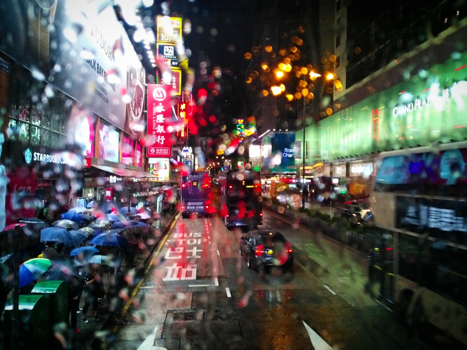 Nathan Road on a rainy Tuesday evening, as seen from the upper deck of Bus A21 from HKG.